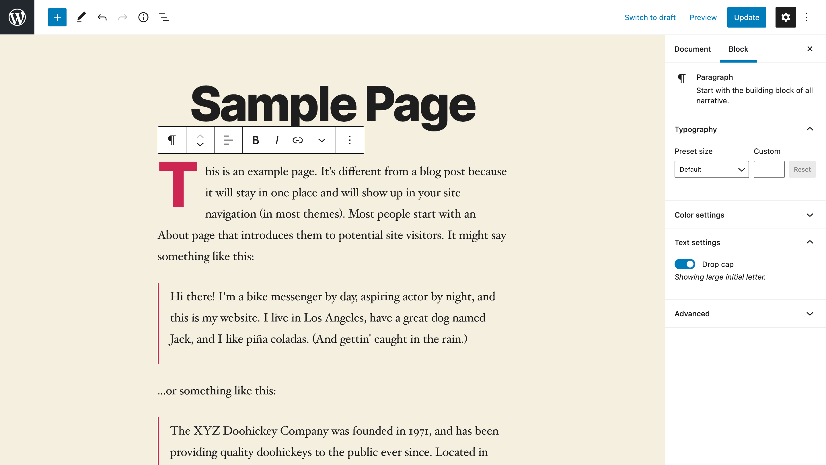 The WordPress Gutenberg editor launched with a curious feature cribbed from the Medium editor: an option to add a drop cap to a paragraph