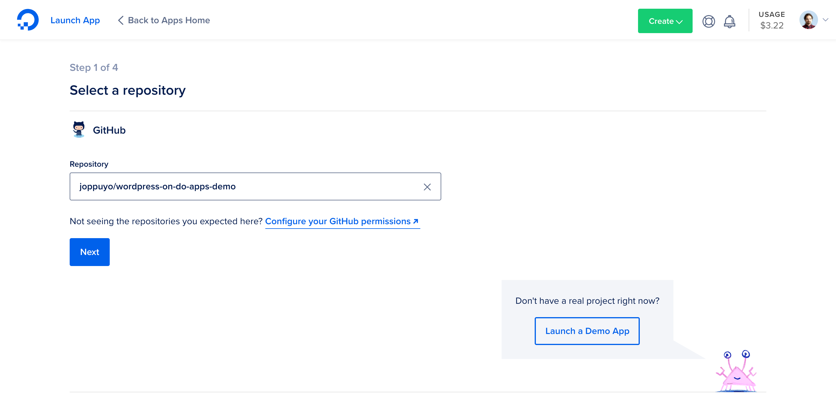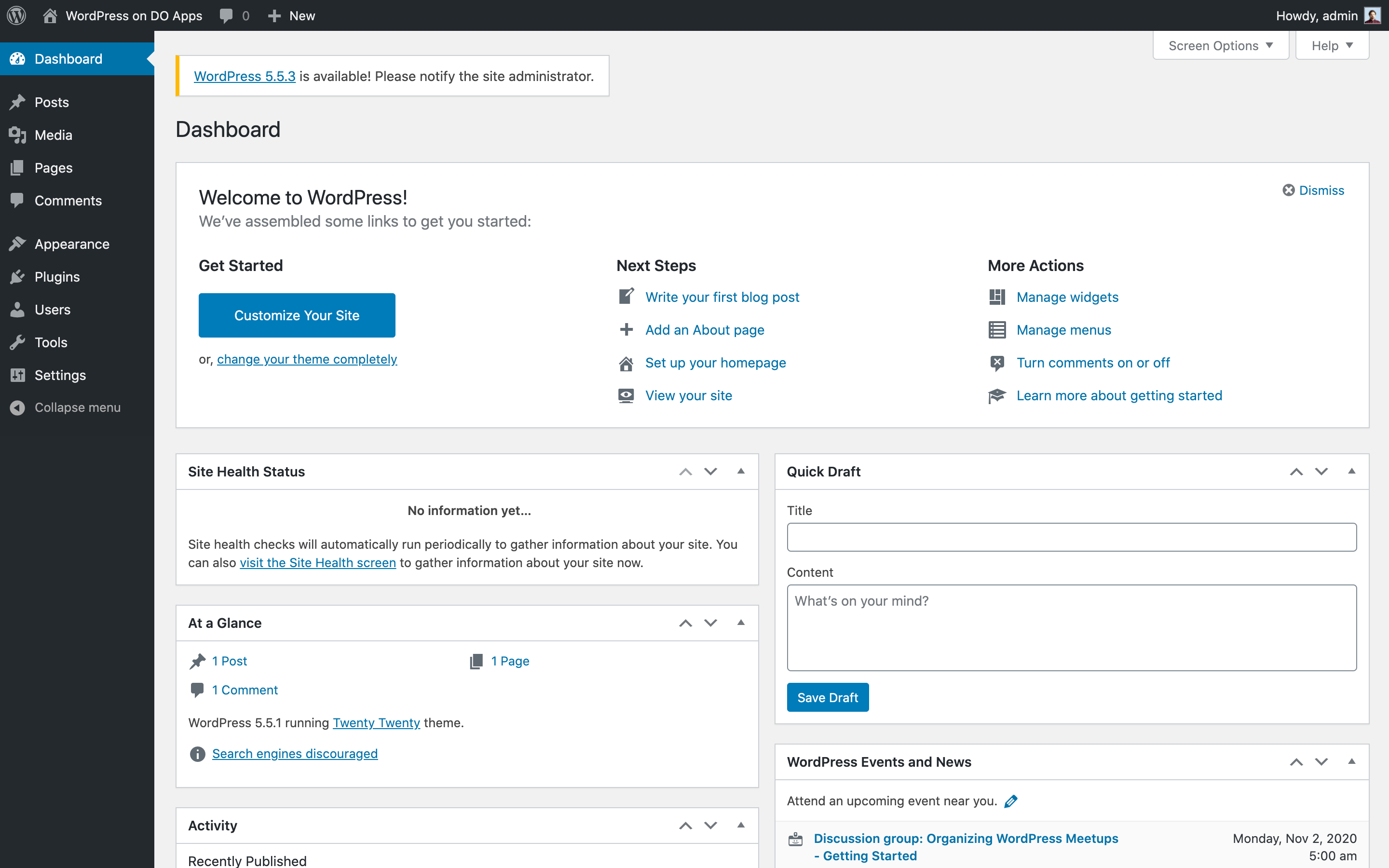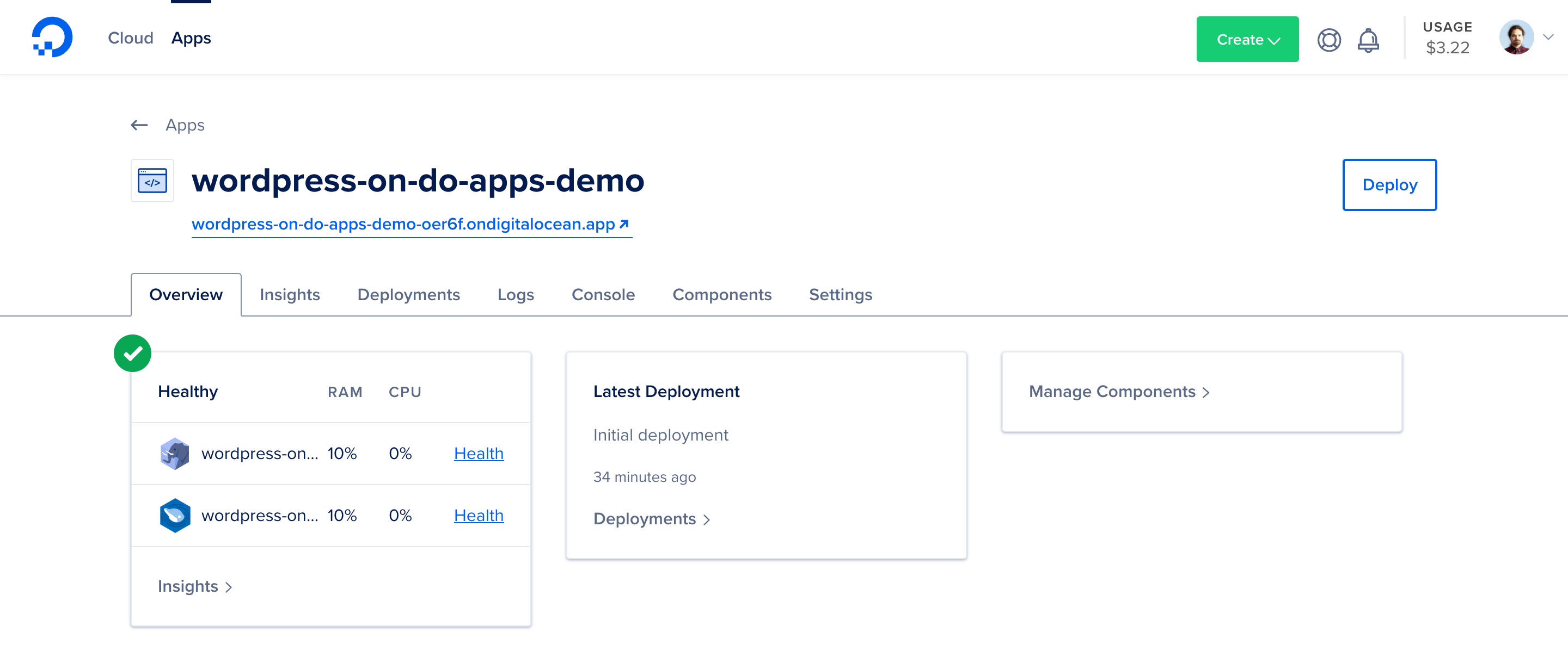 Congratulations, you now have WordPress running in DigitalOcean App Platform! There are still two problems we need to solve, both have to do with WordPress media.