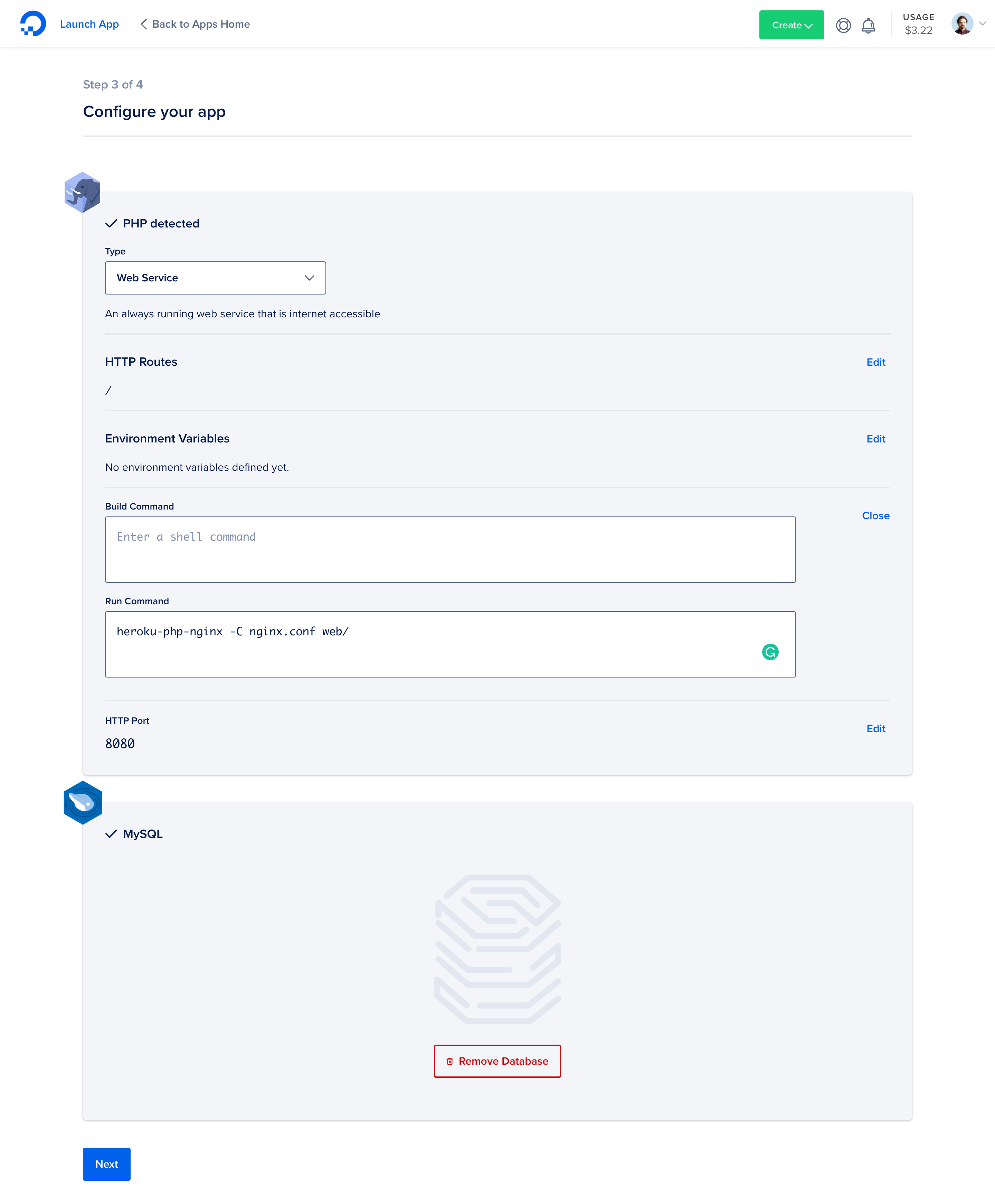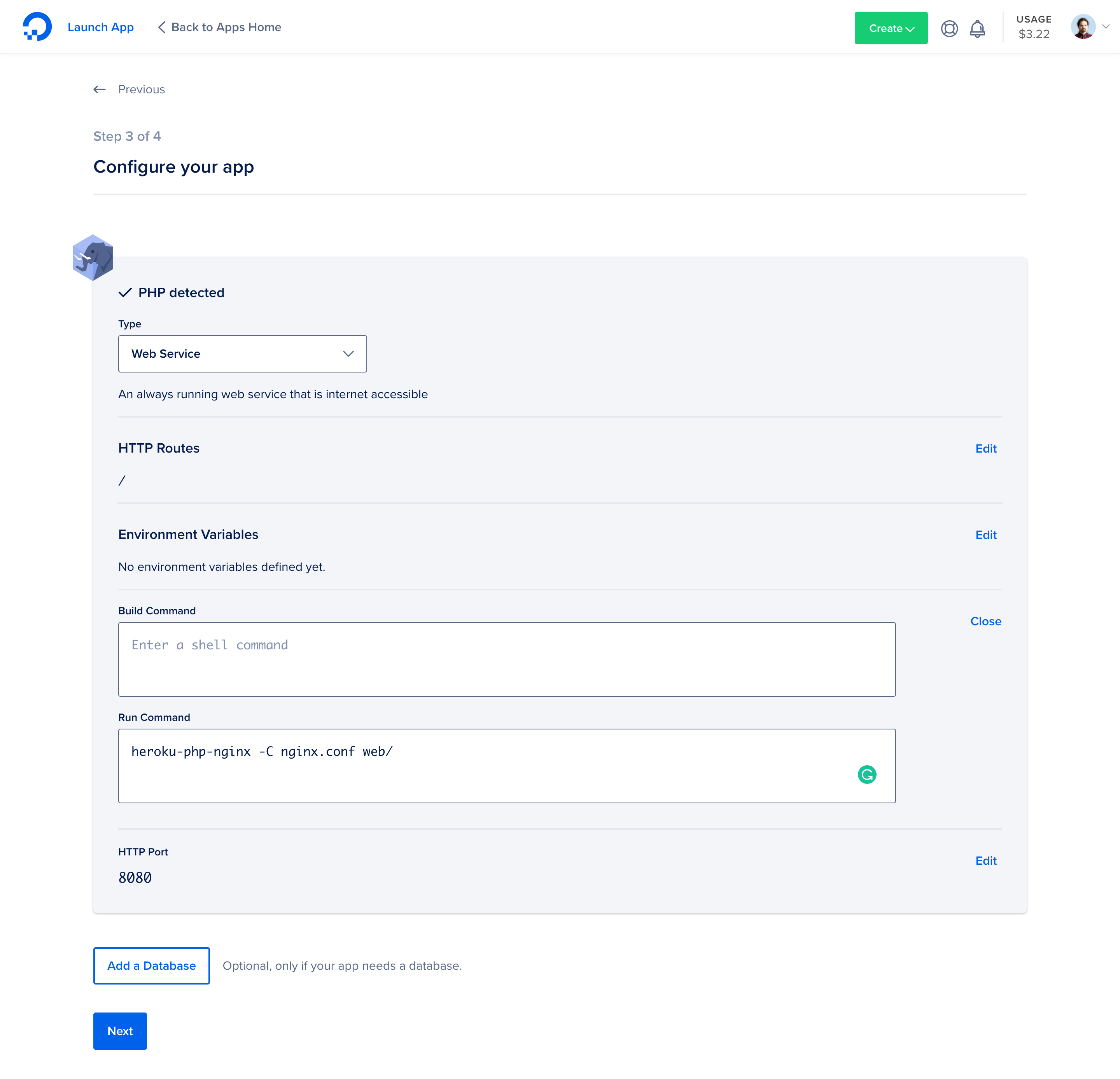 App platform will autodetect your app type as PHP, but we’ll need to configure a few things. For run command, enter