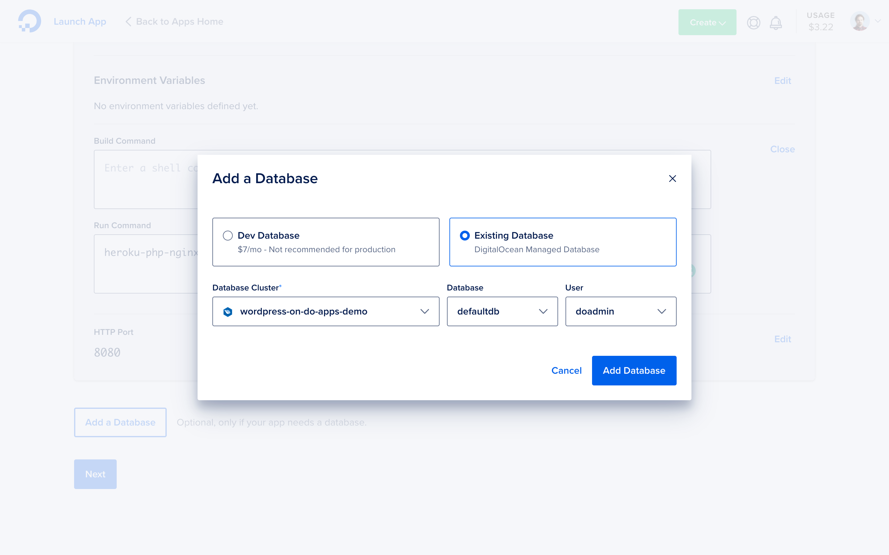 After this, click “Add a Database”, click “Existing Database” and select the database we created before. Select the default database and user.