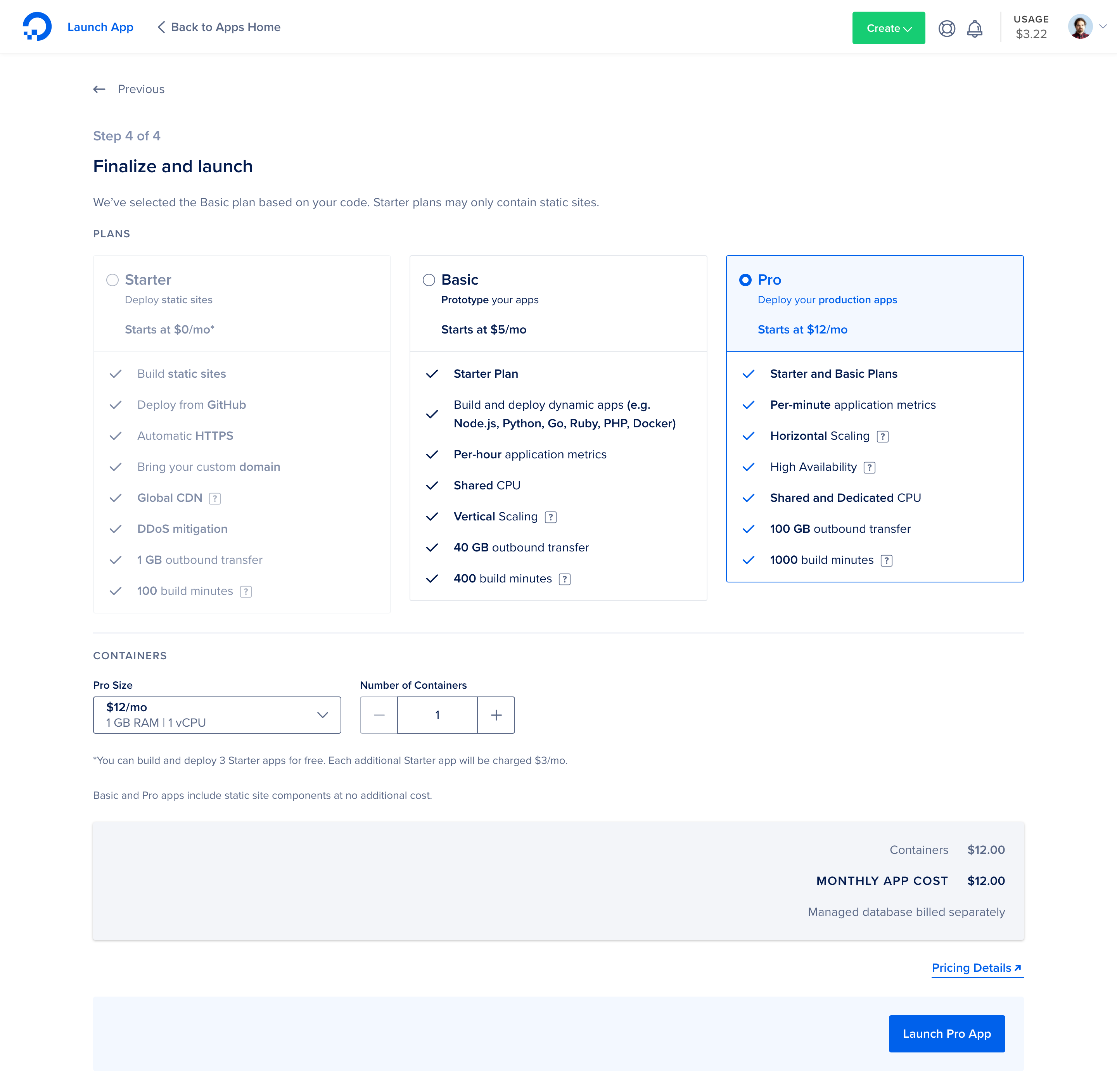 Select which pricing tier you want to use, I’m going to use Pro. Also, select the container size.