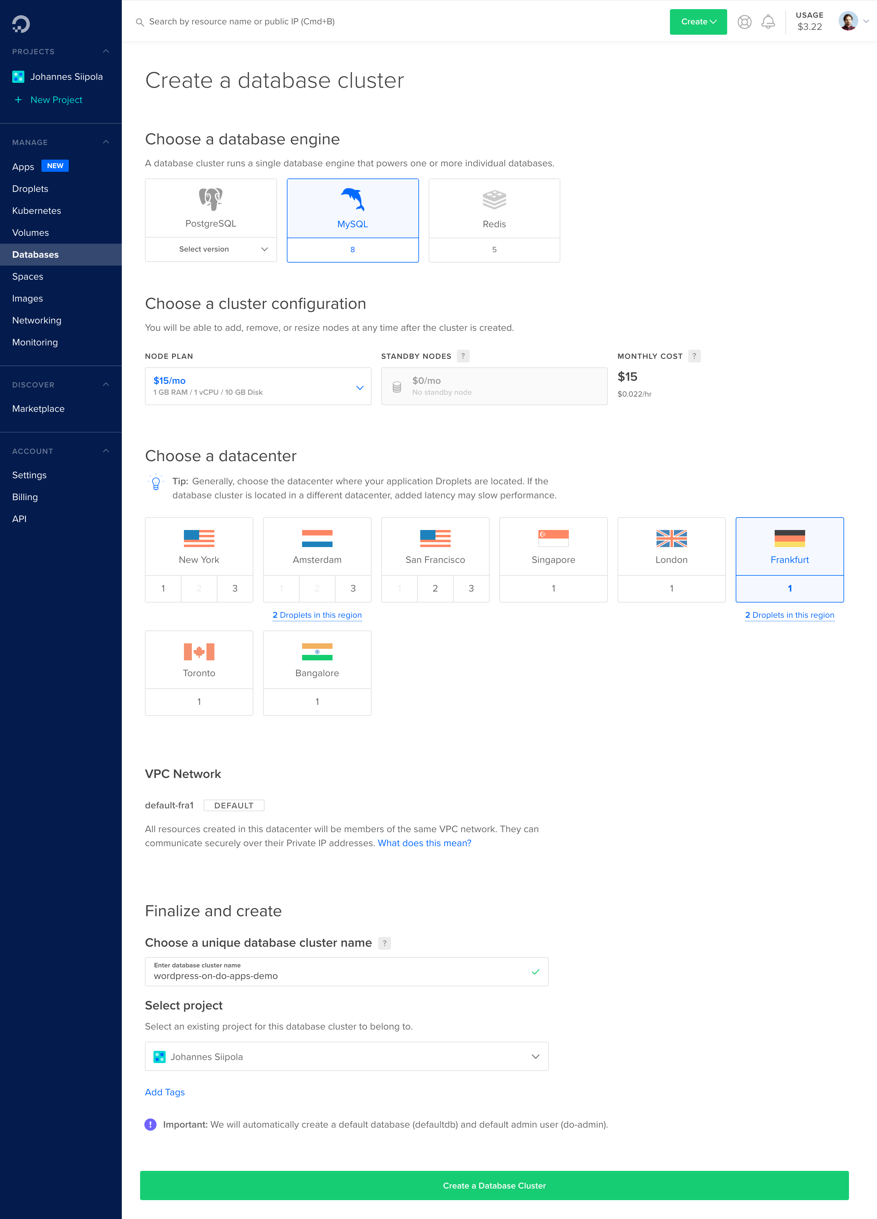 To store our data, we’re using a DigitalOcean Managed Database. Add a new database in the DO admin panel and select MySQL as the database engine.