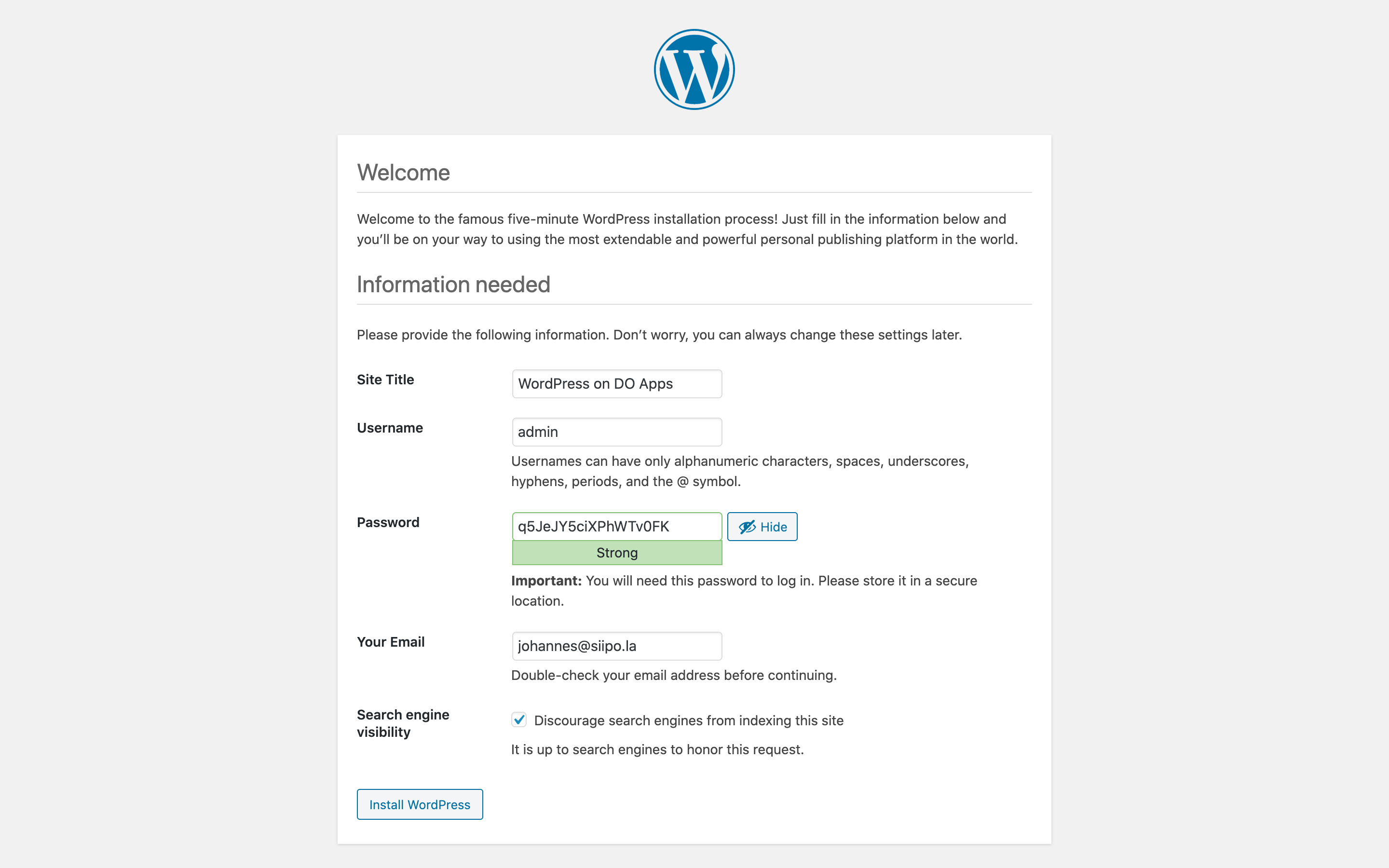Saving the environment variables will redeploy the site. After this is done, we need to complete the WordPress installation wizard.