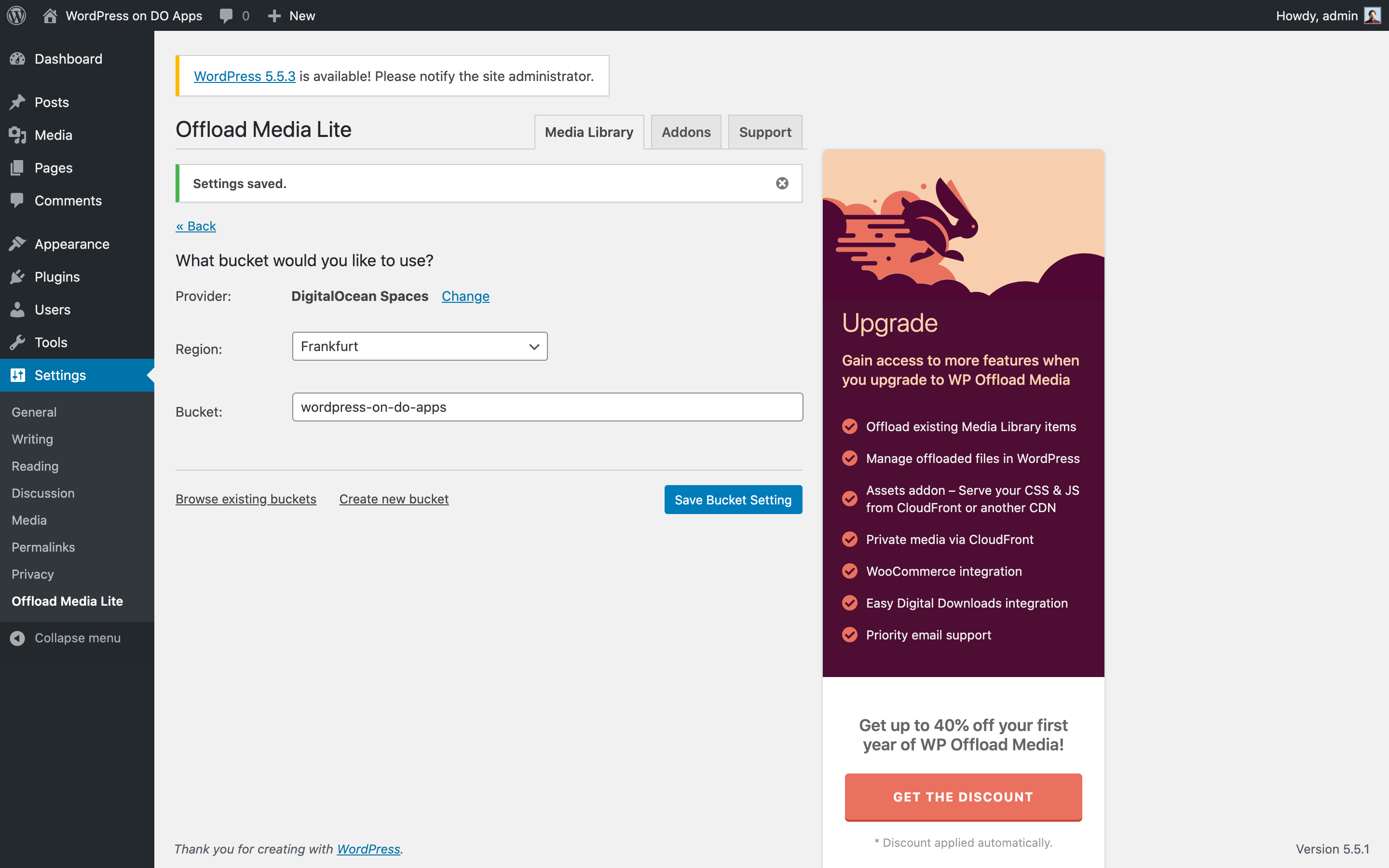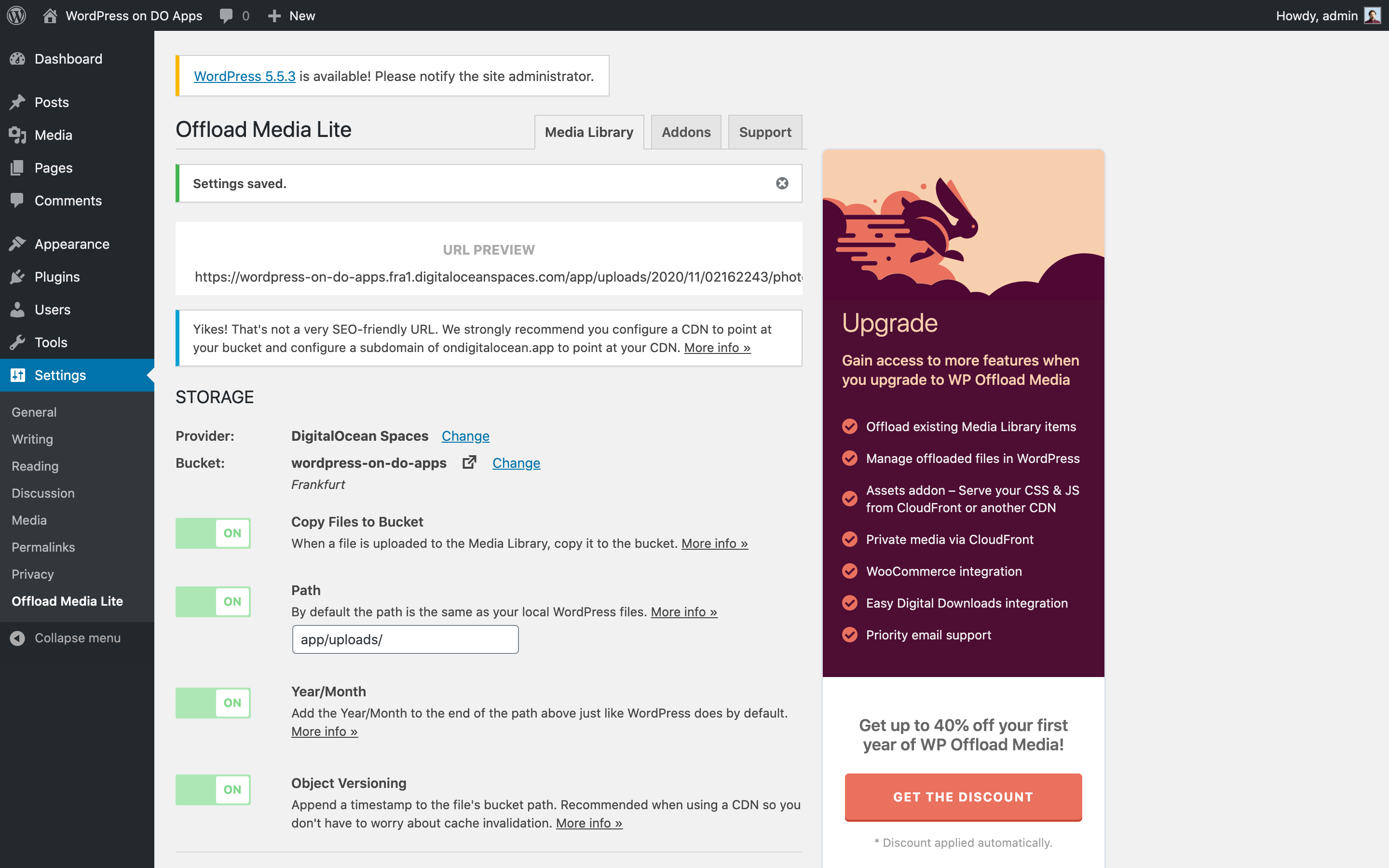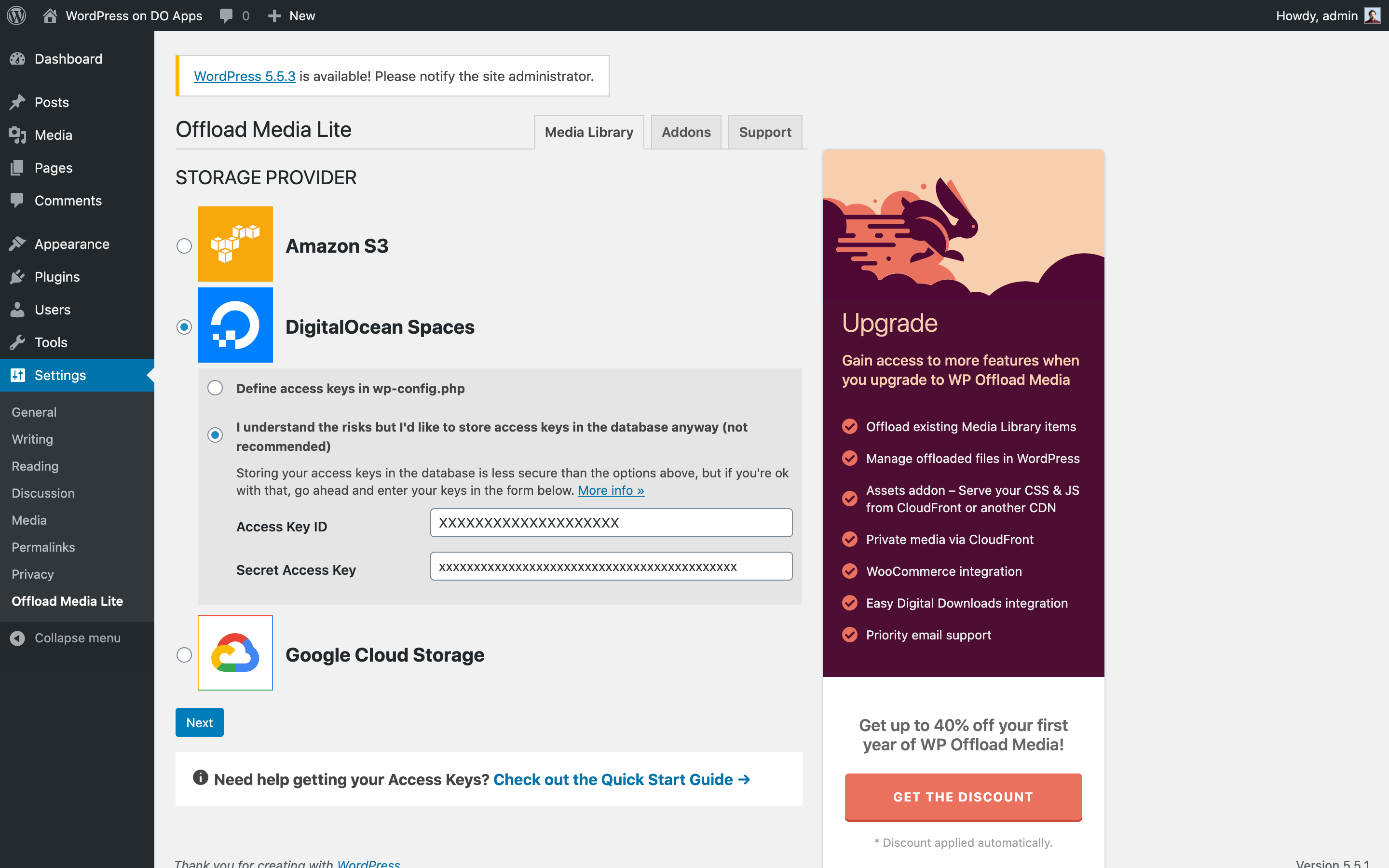 On the WordPress side, activate the WP Offload Media plugin and enter the access keys on the plugin options page.