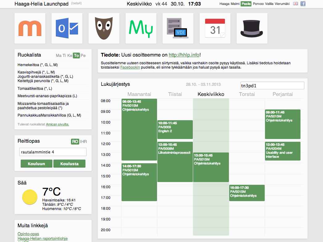 Information portal for Haaga-Helia students. Created in co-operation with Richard Lewis during our first year in Haaga-Helia UAS, the site enables quick access to many information sources convenient for students, including: